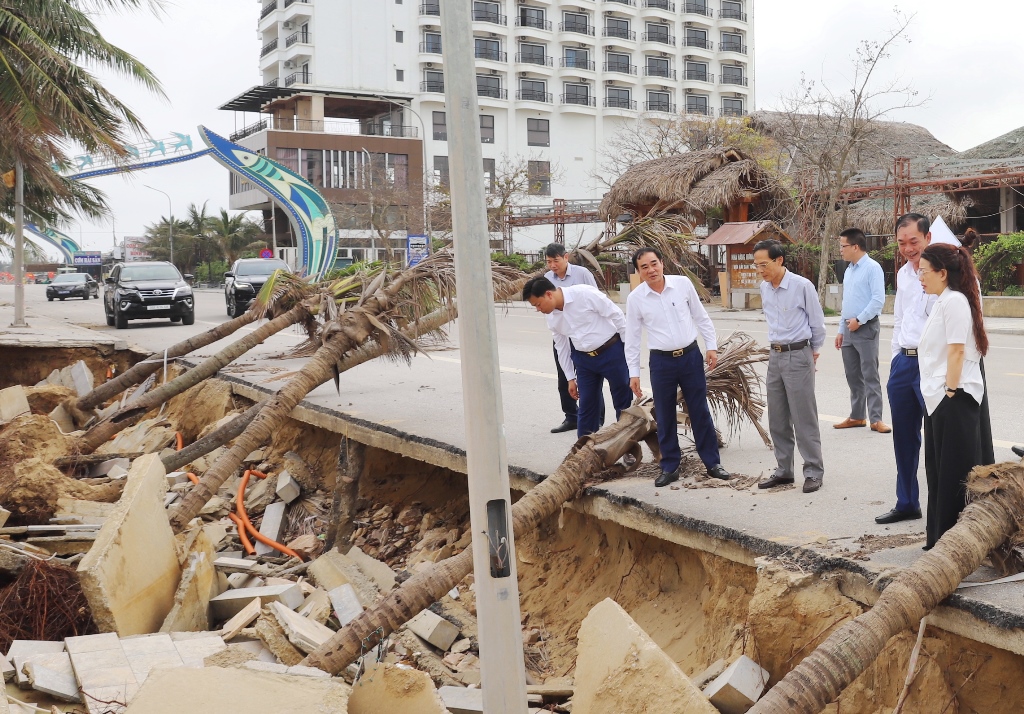 | Đoàn công tác đi kiểm tra một số điểm bờ kè bãi biển bị sạt lở. |